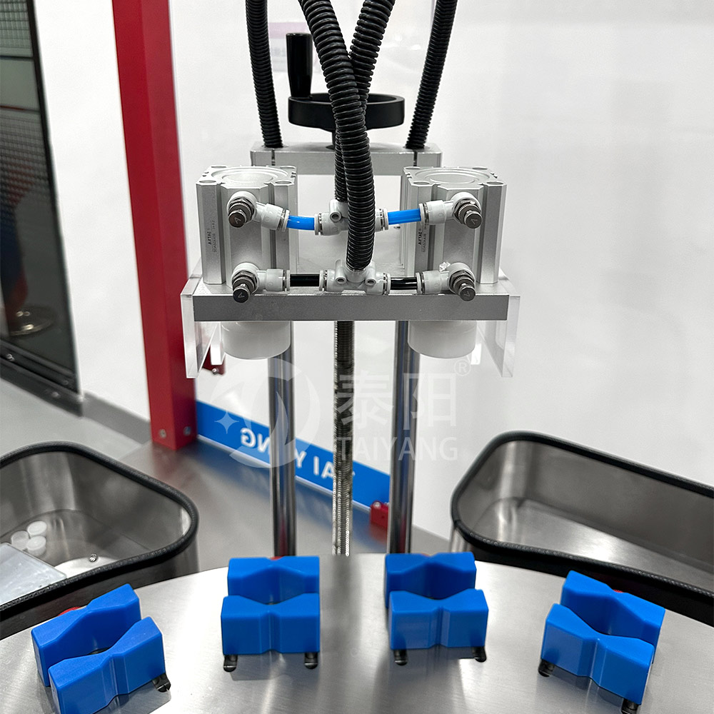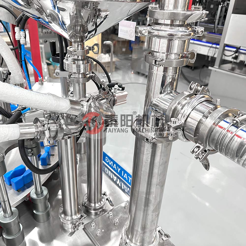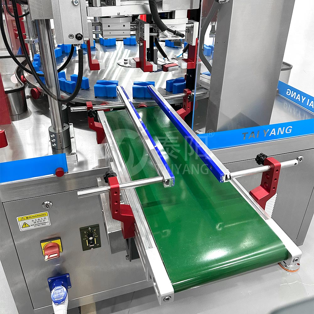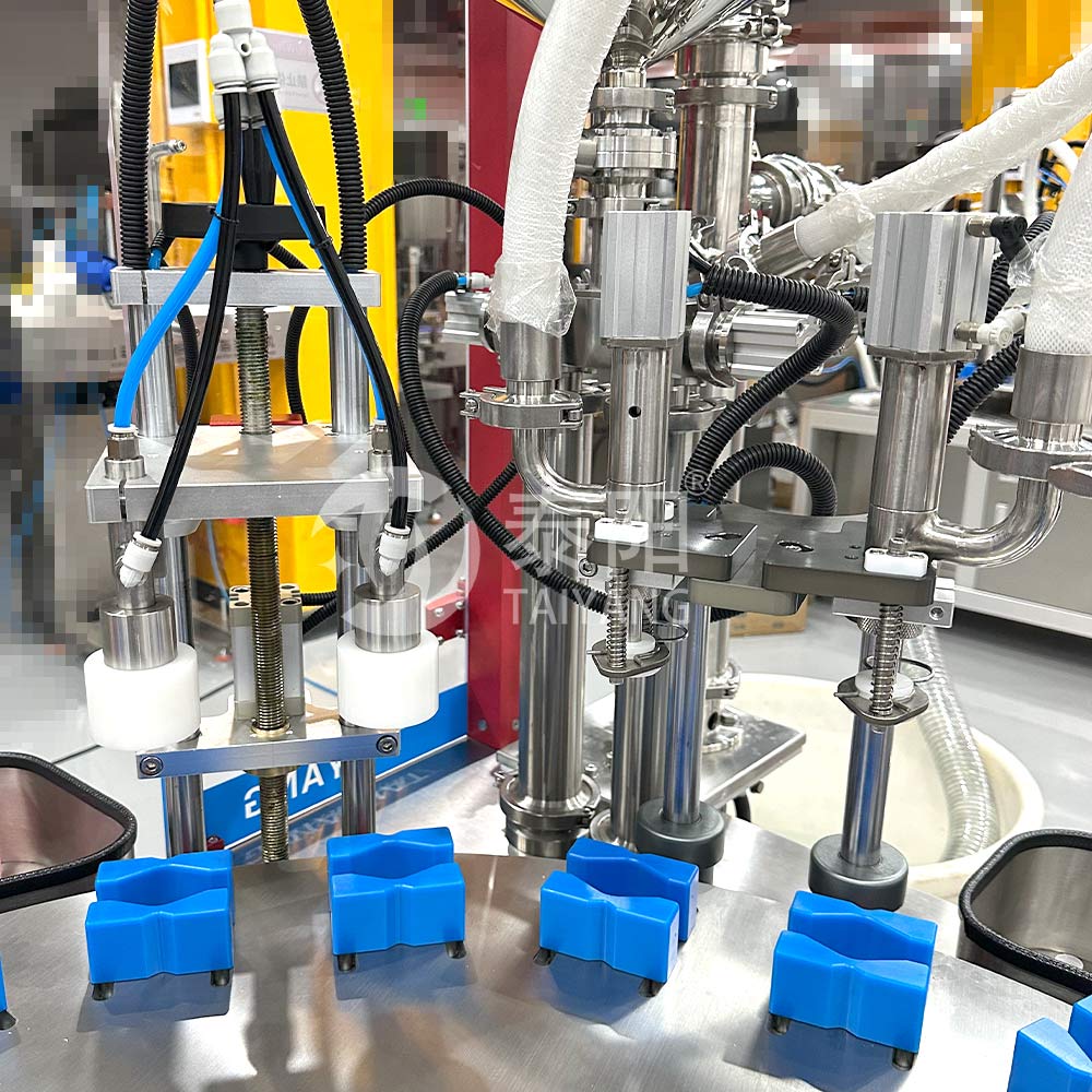 The frame of Taiyang Lotion Cream Turntable Filling and Capping Machine is designed with high-quality and beautiful aluminum profiles, 304 stainless steel for sealing plate, 316 stainless steel for filling liquid, and all pneumatic components are Taiwan AirTAC.The touch screen is WEINVIEW/Siemens/Kinco l0-inch screen, and the programmable controller PLC is OMRON, Delta servo controller, Двигун GPG та розподільні пристрої для Schneider.